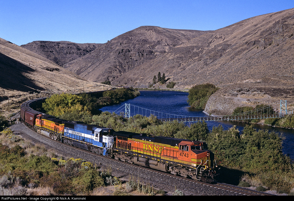 | An eastbound grain empty winds it's way through the scenic Umtanum Ridge Water Gap on a rather warm late summer afternoon. Designated the first scenic byway in Washington State, the Yakima River Canyon cuts a beautiful (up to) 2000 ft. deep recreational oasis between the rather harsh and desolate Umtanum and Manastash Ridges of Miocene epoch basalt flows. No, that's not a tiny highway suspension bridge. The foot bridge provides access for one of the many river recreational pursuits along the Yakima River. Chief among these is spectacular (and lightly patroned) fly-fishing, particularly for large wild rainbow trout. Umtanum is is a great place to spend a summer's day and maybe you just might see a train. The ridge to the left provides trail access to some spectacular high canyon views; just bring plenty of water. Scanned From Transparency: Kodak KM 25 |
