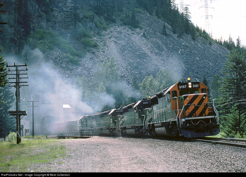 Storming out of the east portal of Cascade Tunnel, BN stacks show off their muscle behind a tiger striped GP50 and 3 SD40-2's |