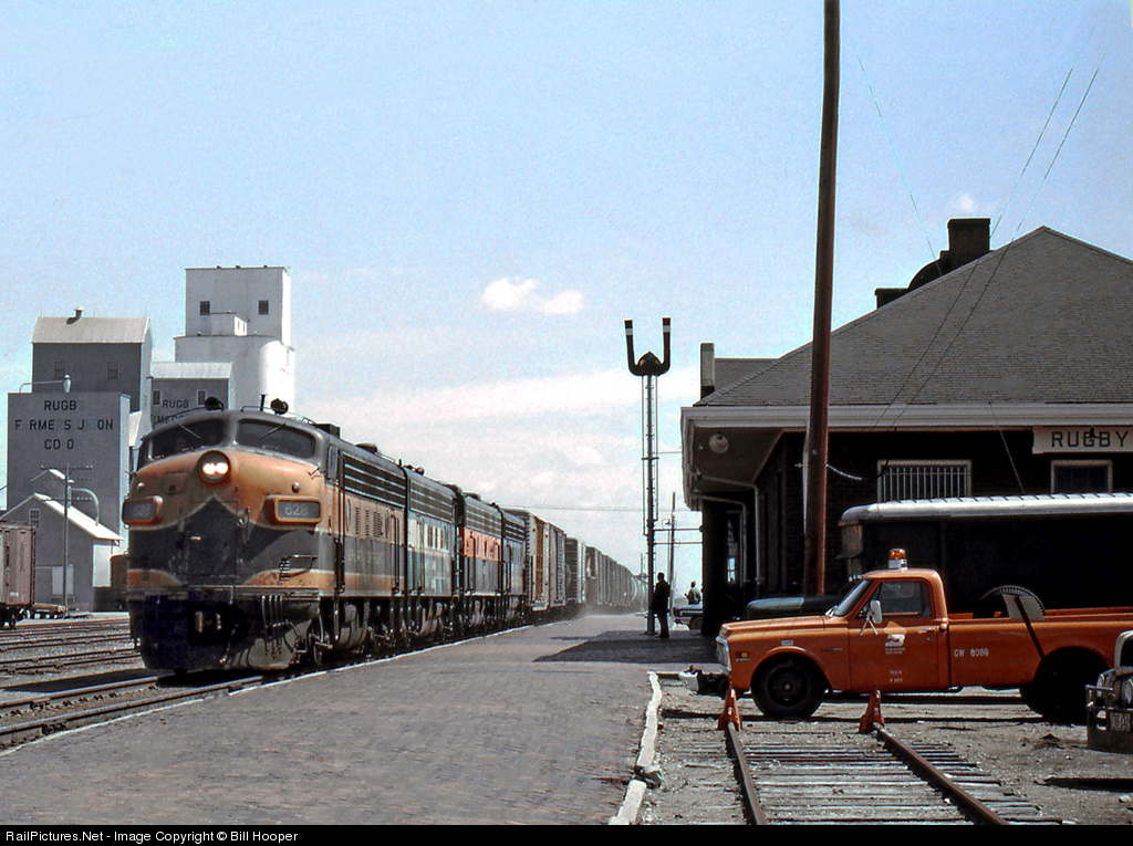 Heading home to Manitoba I stopped at Rugby, which had a manned station at the time, and was told a westbound was coming within minutes. I took the photo and headed on my way not realizing at the time the significance of the shot. A solid set of covered wagons in paint schemes of a post merger BN, the trailing unit is in NP colours.