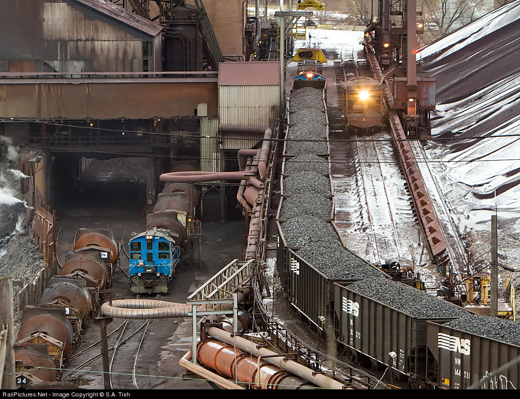 | It takes lots of little trains to keep a blast furnace running. At left CWRO 206 works the C5 blast furnace switching bottle cars while up on the high line CWRO 211 holds back a string of coke cars while a 3rd unknown Cleveland Works RR locomotive positions a transfer car under the No. 5 ore bridge. |