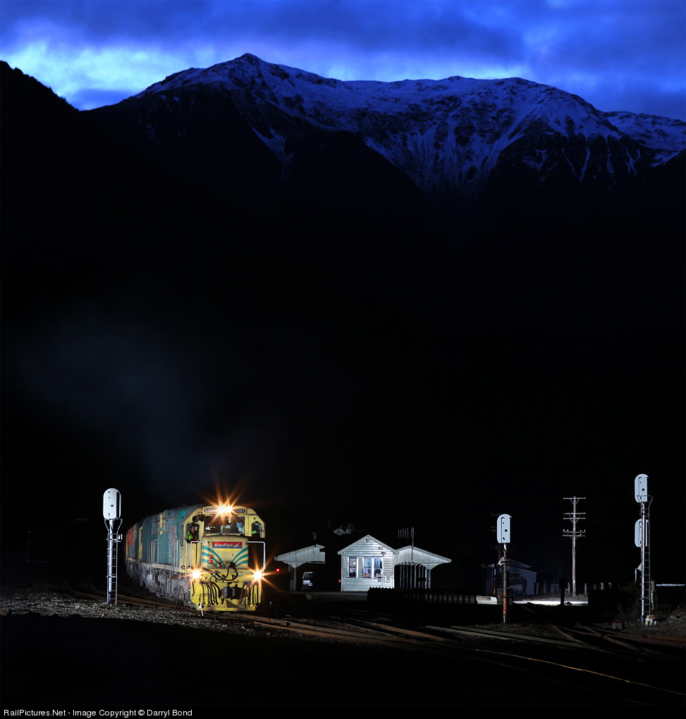 As the last traces of dusk slip over the Southern Alps, five DXs lift a short 18 wagon coal train away from Otira's top yard with less drama than usual. Sitting in a deep valley, the megatropilopolis of Otira is comprised of this quaint old 1920s wooden station, an even quainter and more dilapidated pub, a sprinkling of houses, a generous sprinkling of bad weather, and no cellphone coverage when I was there last. Not a bad place for a railfan to get away from it all really.