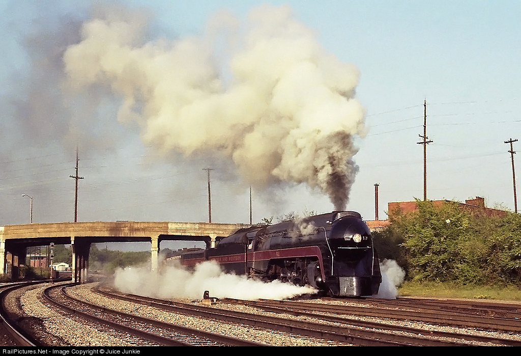 The September 13, 1986 Bluegrass Railroad Museum sponsored Southern Steam Special ran from Lexington, Ky to Chattanooga, Tn, a distance of about 250 miles. Norfolk & Western Class J 4-8-4 611 was the power for this two day trip. N&W 611 was built by N&W in 1950 at Roanoke. She has 70 inch drivers, boiler pressure of 300 lbs, 27 x 32 inch Cylinders, and can deliver 80,000 pounds of tractive effort. In a great display of smoke and steam, N&W 611 leaves Chattanooga on Sunday, September 14, 1986 on the return trip to Lexington, Ky.