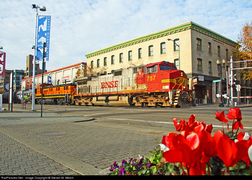 | Something I've never seen in over three years of shooting the BNSF Warm Springs Local... A Dash 9 and a Genset! BNSF 757 leads a NRE 3GS21B down Jack London Square, with some flowers telling us its time for the holidays. |