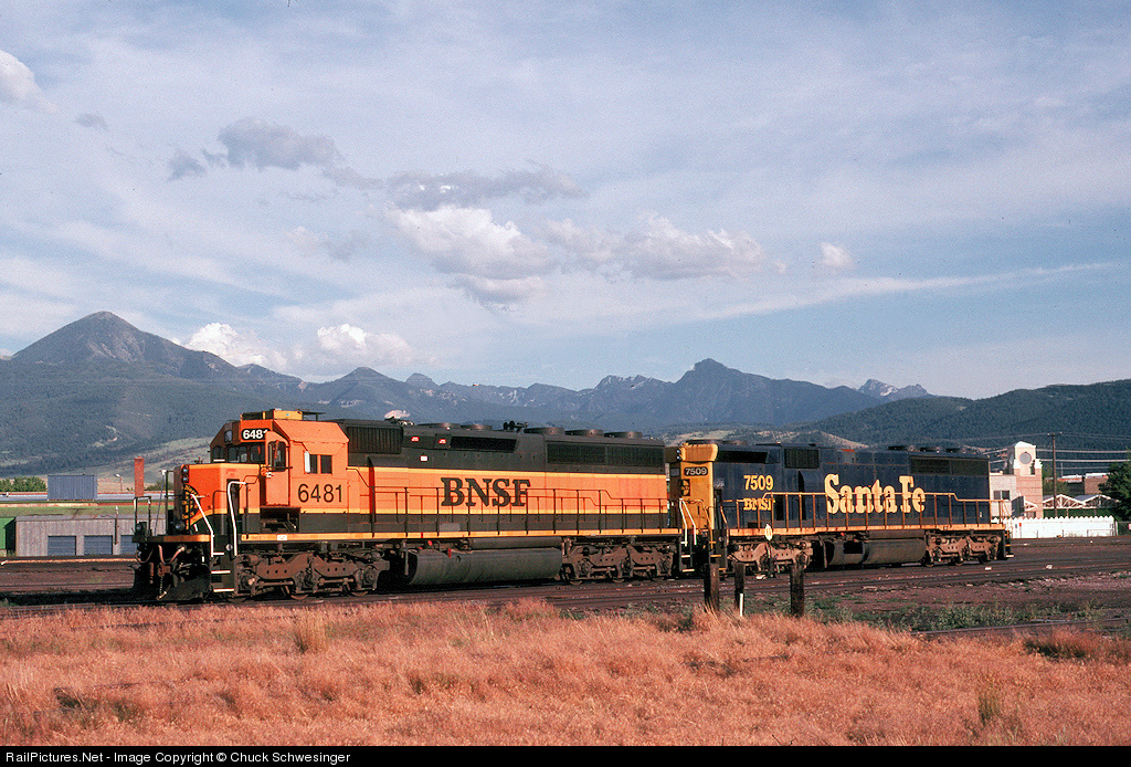 | Kind of an odd pair rest outside the shop at Livingston. BNSF 6481 and 7509 have been set off by a westbound and await work in the ex NP shop. |
