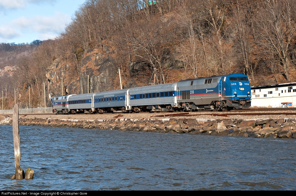 | Metro North Holiday Train at Peekskill, New York. The train is heading North for a stop at Poughkeepsie. Metro North P32AC-DMs bracket the train. 210 on the north end, and 206 south. |