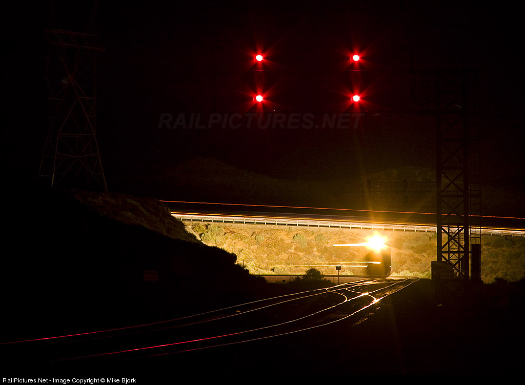 | Wide Open. Late at night on the Cajon, two lonely UP SD70ACe's roar up the hill as fast as track speed allows. In the background, the traffic of I-15 continues downgrade uninterrupted by rail traffic. |