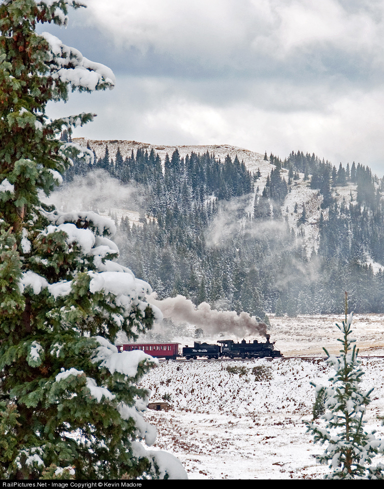 Autumn comes to the high country! A mere 3 days after the official end of summer, the Colorado high country already looks like it's late November. In this scene, an eastbound Cumbres & Toltec train from Chama, NM to Antonito, CO drifts through the famous Tanglefoot Curve, just a mile or so after topping the 10,000 ft high Cumbres Pass. An early season snow storm the day before has deposited about 4 inches of the white stuff on everything, providing a gentle reminder to both the tourists and the railroaders that the excursion season on this line is rapidly drawing to a close.