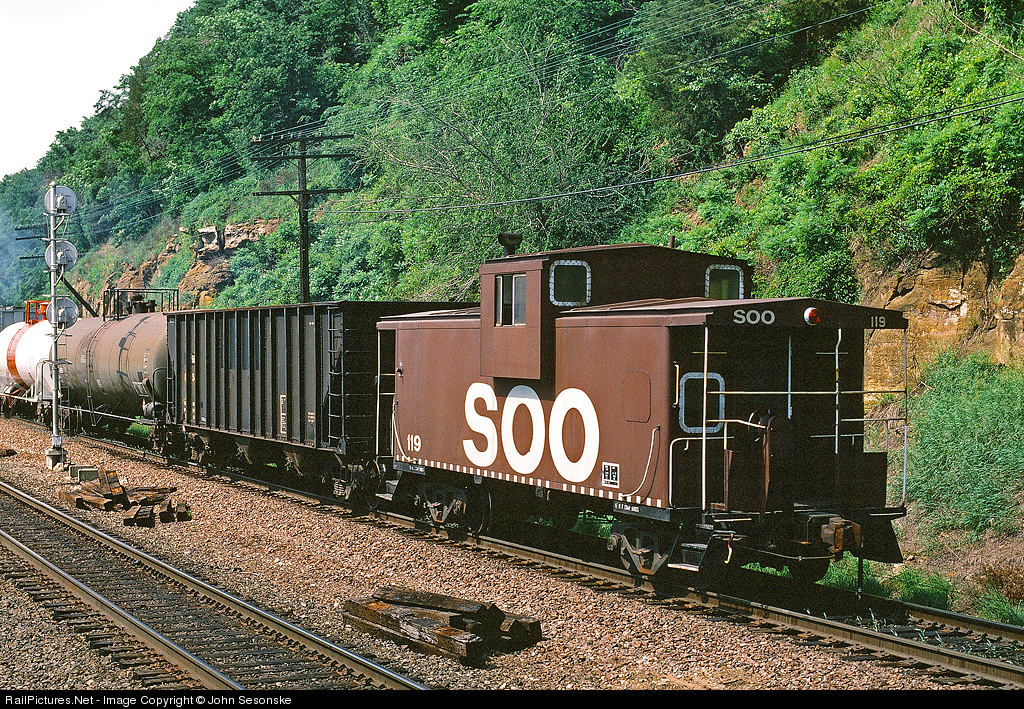 One of the SOO cabooses in the brown scheme brings up the rear of a NB SOO local.