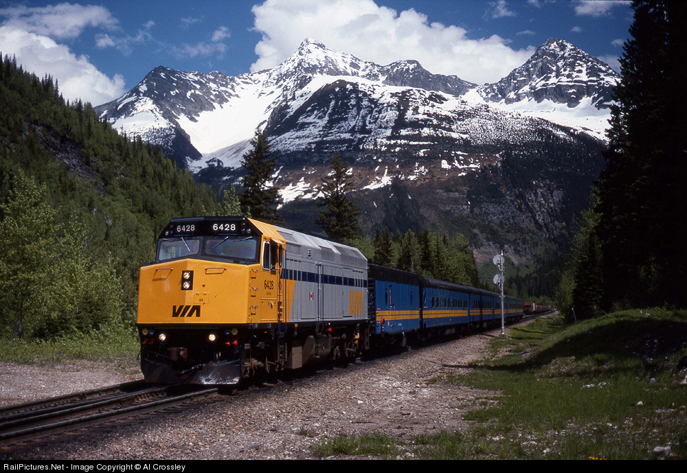 Today's pop quiz: What VIA train is this? Well, before there was a Rocky Mountaineer, today's private-operator luxury cruise train, VIA ran its own version, called Rockies By Daylight, establishing the daylight-only format with an overnight stop that's still used. Here we see the first westbound run at the west end of Glacier siding after meeting an eastbound freight, distant. Rumors that it would run behind F units were, disappointingly, mistaken, but you can't argue with the scenery. And perhaps if VIA had put together something more upscale than the tentative, coach-and-box-lunch production seen here, they'd still have the market today.