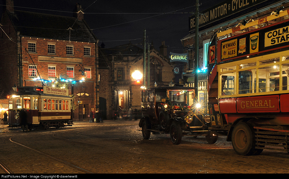 Beamish museum opens up for two nights close to Christmas when it decorates the town in the style of Christmas 1913. Here a tram waits at the main tram stop in the town whilst an omnibus of the period waits to take passengers in the opposite direction.