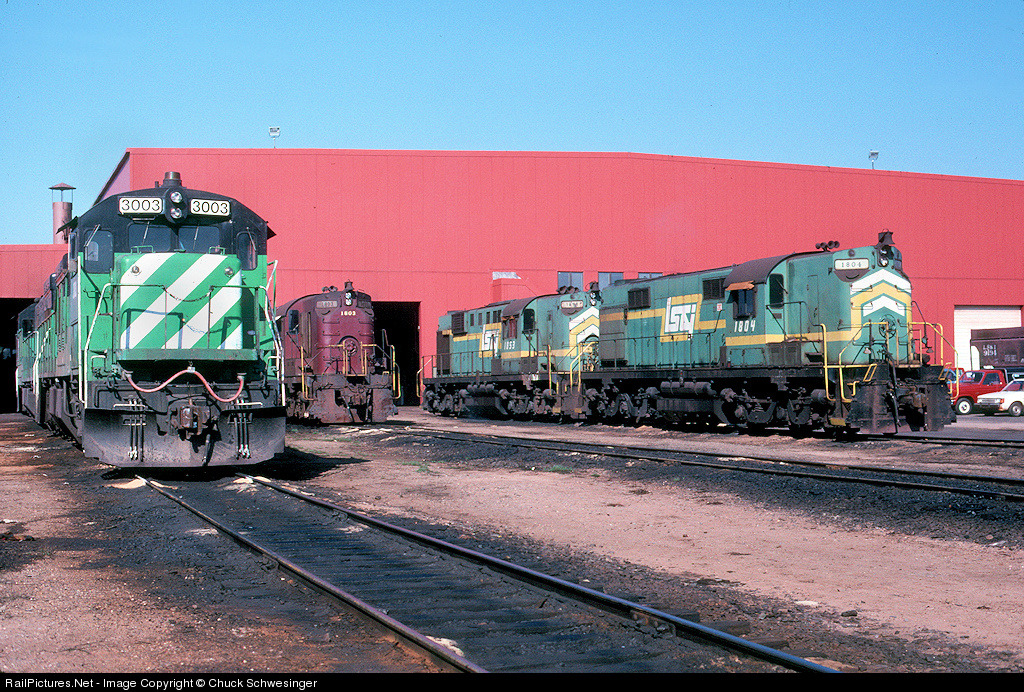 The spring of 1989 was a time of change on the LS&I as ex BN U-boats replaced the Alco's and LS&I's original U23/25C fleet. Here at Eagle Mills a couple ex BN's wait for shop time while already replaced 1803 and a couple more still in service RSD12's, 1804 and 1853 wait along side.