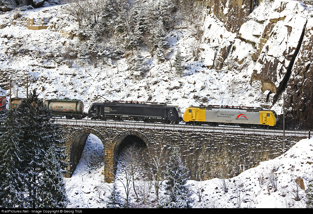 | Freight train of TXLogistik (owner for 51 % Trenitalia) with locomotives ES 64 F4-096 in TXLogistik colors and ES 64 F4-098 in black, both rented from Mitsui Rail Capital Europe MRCE, on the northern ramp down from the Gotthard tunnel between Wassen and Gurtnellen near Pfaffensprung. |