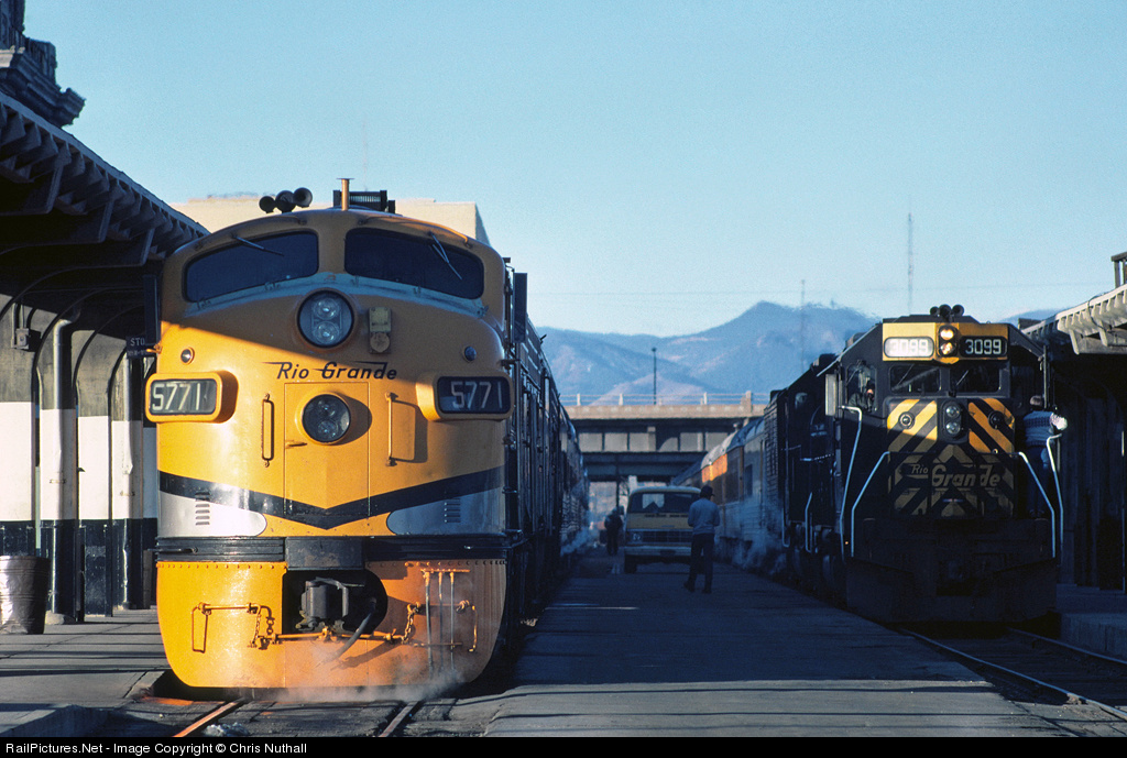With a good head of steam, 5771, on the head of the Rio Grande Zephyr, awaits its 07.30 departure time, while 3099 and 3123 lurk in the shadows of Denver Union Terminal with that Saturday morning's Ski Train, in March 1982.