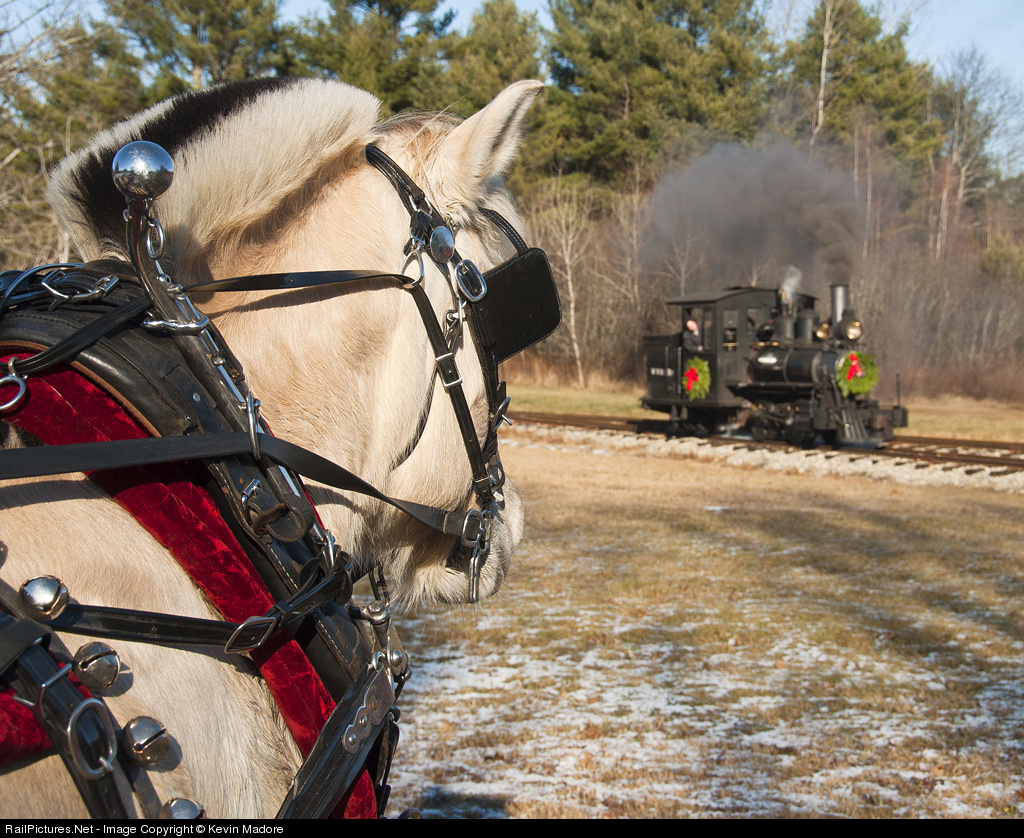 Yes Virginia, there ARE equine railfans. Meet Nikki. She's a 4-year old Norwegian Fjord Horse from Golden Lane Fjords in Damariscotta, Maine. She and her teammates have become regular participants and the Wiscasset, Waterville & Farmington Railway Museum's annual Victorian Christmas event. The horse teams provide wagon or sleigh rides for museum patrons, depending on the snow situation. And yes, I have determined that Nikki is a die-hard railfan. Whenever the line's steam engine shows up at Alna Center, this little gal can't take her eyes off it. She'll look over her shoulder, or over her teammates to check out the action. Fortunately, for this trip, her owner Steve conveniently positioned the team to give Nikki a front row seat!