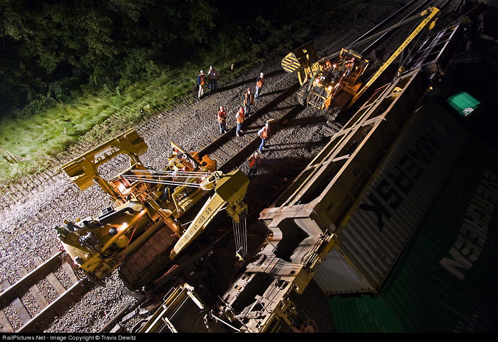 A broken axle was the cause of this derailment that sent a bunch of well cars and their containers to the ground in Hager City, Wisconsin. Clean up started soon after and went through the night to get the transcon back up and running. Hulcher was on scene and is seen here flipping a well car out from under it's containers. Once freed from it's load, the car will be brought down the tracks and placed in a clearing with the rest of the derailed cars.