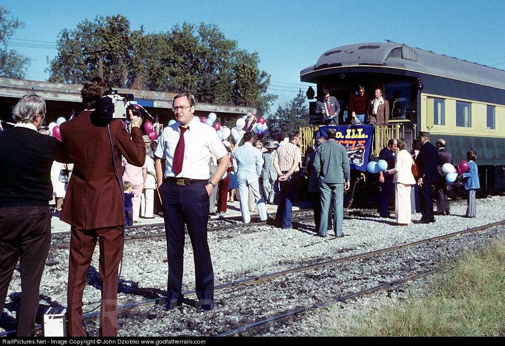 Govenor "Big Jim" James Thompson (see the belt buckle) makes a whistle stop in downstate Cairo during the 1978 re-election campaign, which he won getting 60% of the vote. The train was pulled by a Crab Orchard & Egypt steam engine on the IC mainline