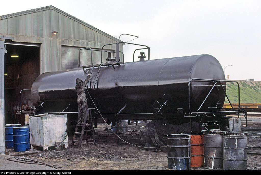 | A worker at the GATX car facility in Bloomington, California (adjacent to the Southern Pacific's West Colton Classification Yard. It's a good thing he's wearing protective gear and clothing, as he's about as covered with black paint as the tank car itself! |