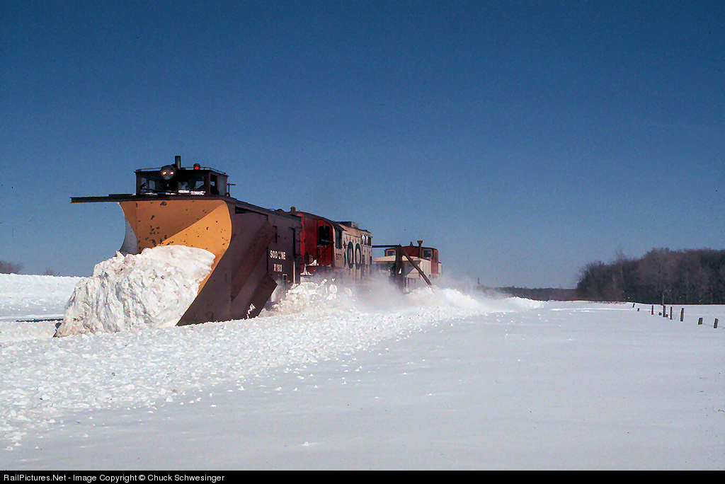 Soo GP7 377 is the power for Russel plow X-183 as it works it's way west widening the trail through deep snow that it had made the previous evening. The plow extra had just spent the last three hours cleaning up Trout Lake yard and waiting out a meet with train 912. It's well past noon and this crew will keep working west cleaning sidings and winging back drifts until their hours are up, probably near Manistque on this day.