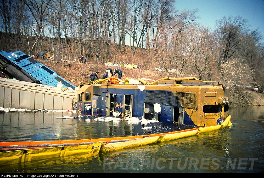 | Shortly before 6 a.m. on April 10th NECR's northbound train 323 hit a washout in Westminster VT along the Connecticut River. The lead unit made it over, and as you can see the trailing units weren't so lucky. It was determined that water diverted from a field above the tracks was the cause. Scanned from a Kodachrome 64 slide. |
