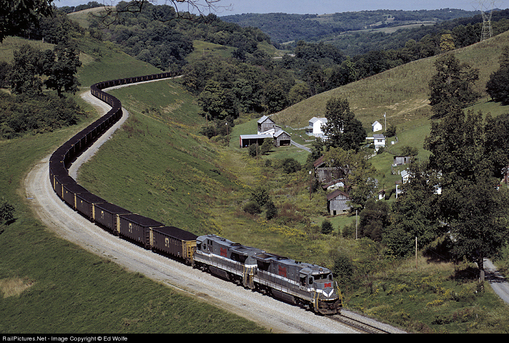 A northbound unit coal train approaches the crest of the Manor Branch amid the rolling farmland at Time, PA. The train was loaded at Bailey Mine, located a few miles back at the end of the branch.