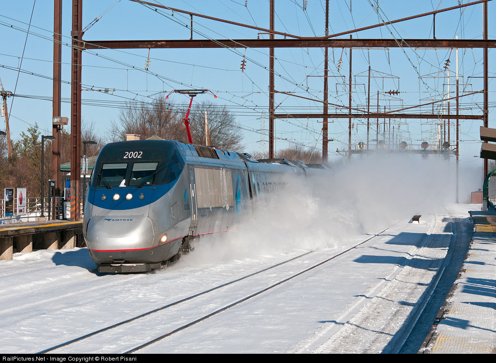 | I would imagine that trains such as this were well patronized in the aftermath of the blizzard since area airports were closed for most of the day. Not quite making track speed, this Acela still looks impressive on its midday run to Washington DC. |