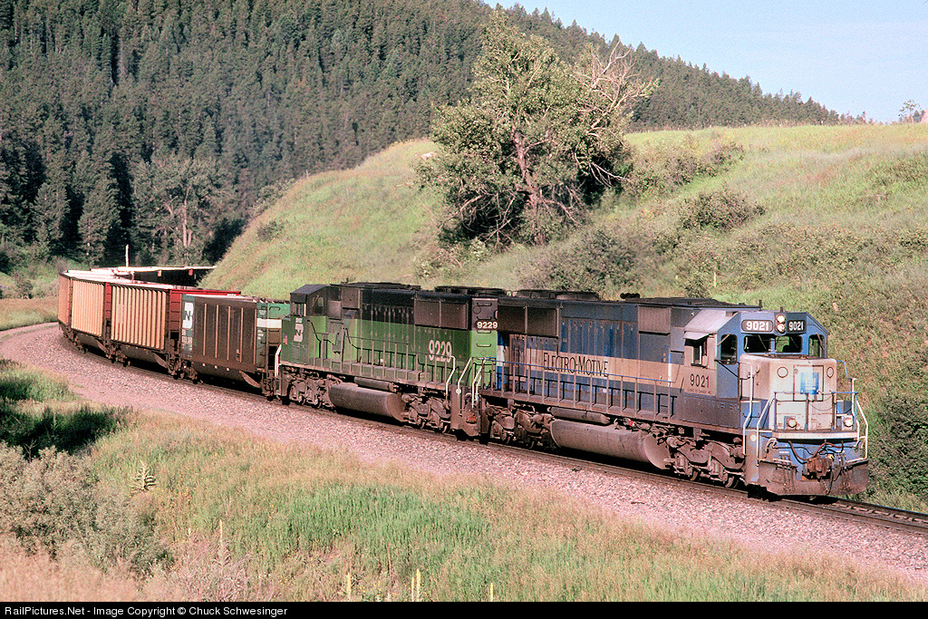 A pair of SD60's lead a eastbound coal empty up Bozeman Pass, The 9021,9229 lead the way and even with an empty this will be a slow trip up the hill.