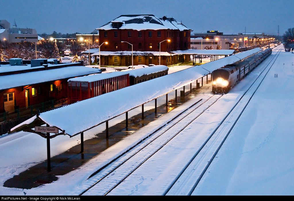 | It's after sunset the night of one of the biggest snows in recent memory in Rocky Mount NC, and frozen switches are wreaking havoc on CSX. A late running P089, after stopping just north of town for the conductor to walk the train to look for a noted defect, was allowed to creep up behind P079 which was still in the station until just a few minutes prior. P079 had been waiting in the station for much longer than usual whilst CSX crews worked to clean out the frozen crossover switches just behind the photographer at "Charlie Baker". |