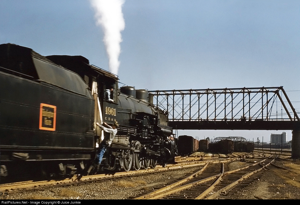 | In the waning days of steam, we made several trips to Burlington's Clyde Yard in Cicero to find steam survivors. After we spent some time near the roundhouse shooting the CB&Q O5a 4-8-4s, we heard a steam locomotive working out in the yard and investigated. Today was indeed our lucky day! CB&Q 4961 was shunting cars around and she too looked like she had just been released from the shops. Shiny black paint, white canvas storm curtains and a shiny number plate were nice accents. With the brakeman hanging on for dear life, CB&Q 4961 passes me with a long string of cars. Please pardon the slight blurring of 4961; Kodachrome 25 was just a bit too slow to freeze the action! |