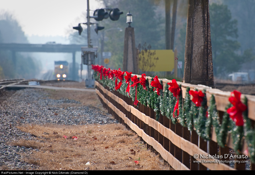 Christmas decorations around the Aberdeen depot with a CSX local switching in the distance