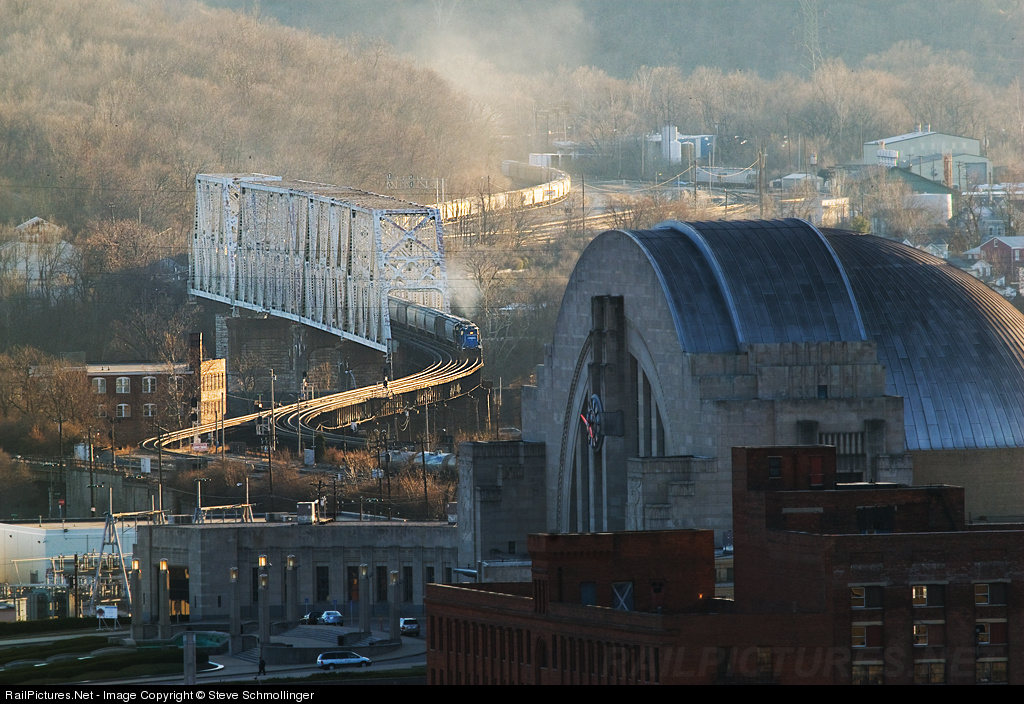 An ex-Conrail SD60 pushes hard on the rear of a heavy grain train as it climbs southward out of Cincinnati up the Ohio River Bridge and Erlanger Hill. In the foreground sits Cincinnati Union Terminal.