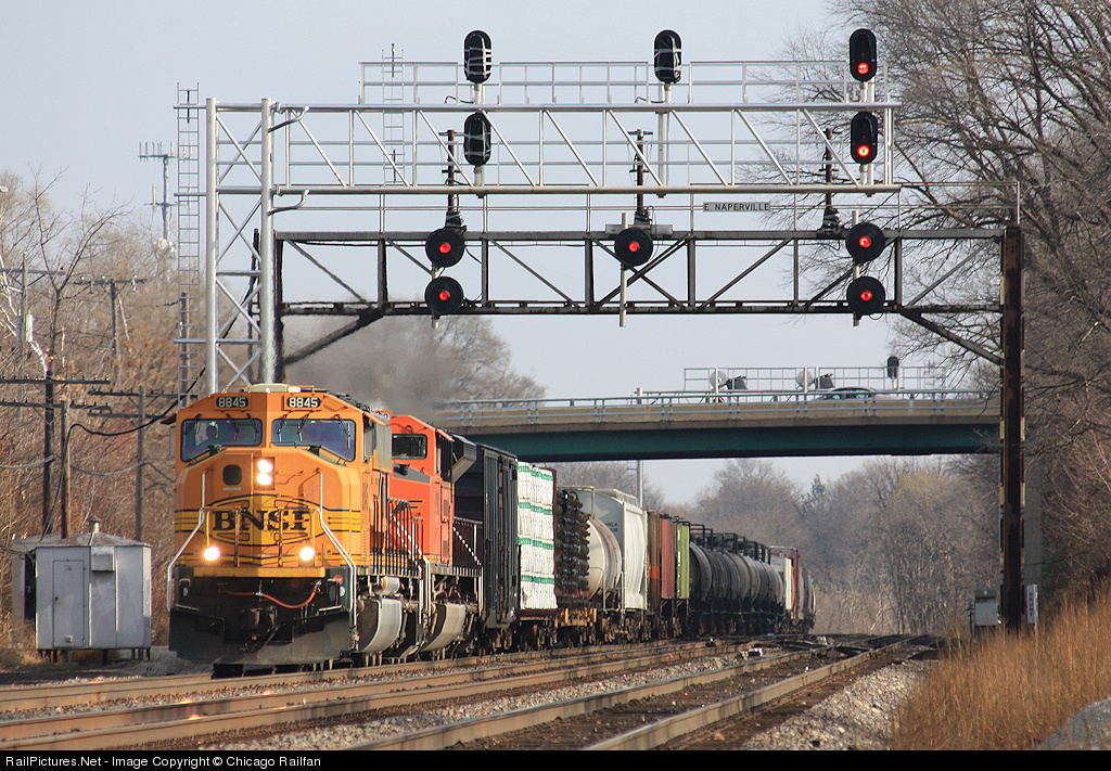 A four aspect signal? Not quite. After years, or what seemed like years with all the coverage of this spot recently, of worry to the falling of the old searchlight signals at Naperville, the day has finally come. November 19'th BNSF crews took down the old search light signals on M3 from MP 29.7 to MP 27.2 and activated the new BNSF Darth Vader signals. Seen here is a sort of mid-work shot, though they activated the new signals for the EB M3 at W. Naperville Control Point hours before they actually cut the track over to them and took the old search lights down. The track was opened in time for the evening rush, which doesn't see much eastbound traffic, but it did help with the westbound expresses. November 20'th would be spent switching the signals on M2, and November 21'st would be spent switching the signals on M3. Bye bye Naperville signals!