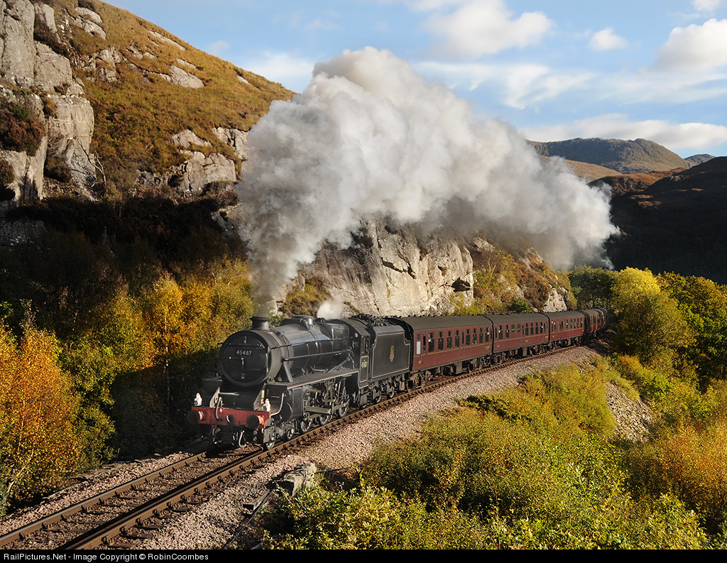 | Climbing steadily a Black 5 makes a fine sight in afternoon autumn sunshine between Fort William and Mallaig on the West Highland extension