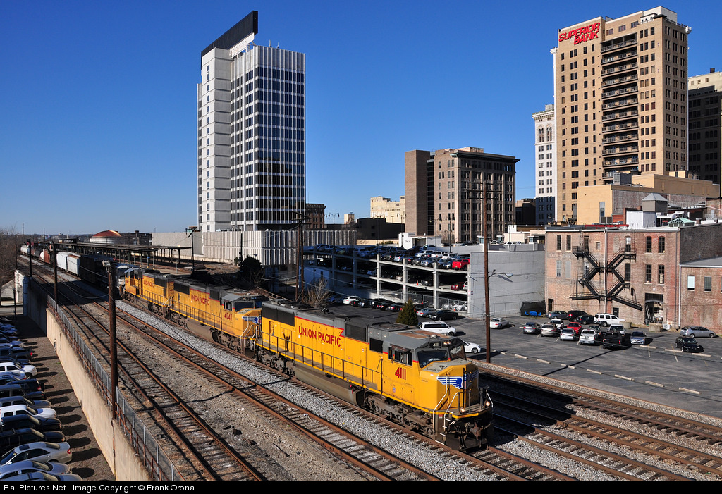 | A 9600 foot long NS 314 slowly makes its way into Birmingham with a "hat trick" of Union Pacific locomotives at the head end, with the first one being much cleaner than the next two. |