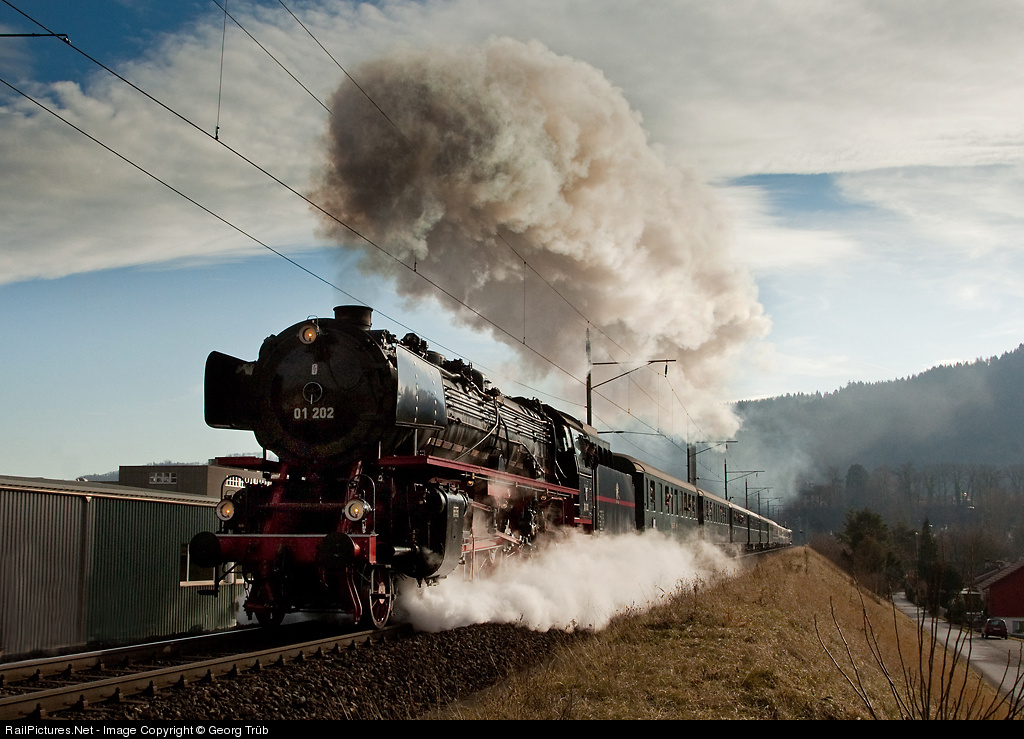 | Ex German Pacific 4-6-2 of Association 01 202 in Lyss is pulling a long special train round the Lägern mountain and accelerating to track speed towards Koblenz. |