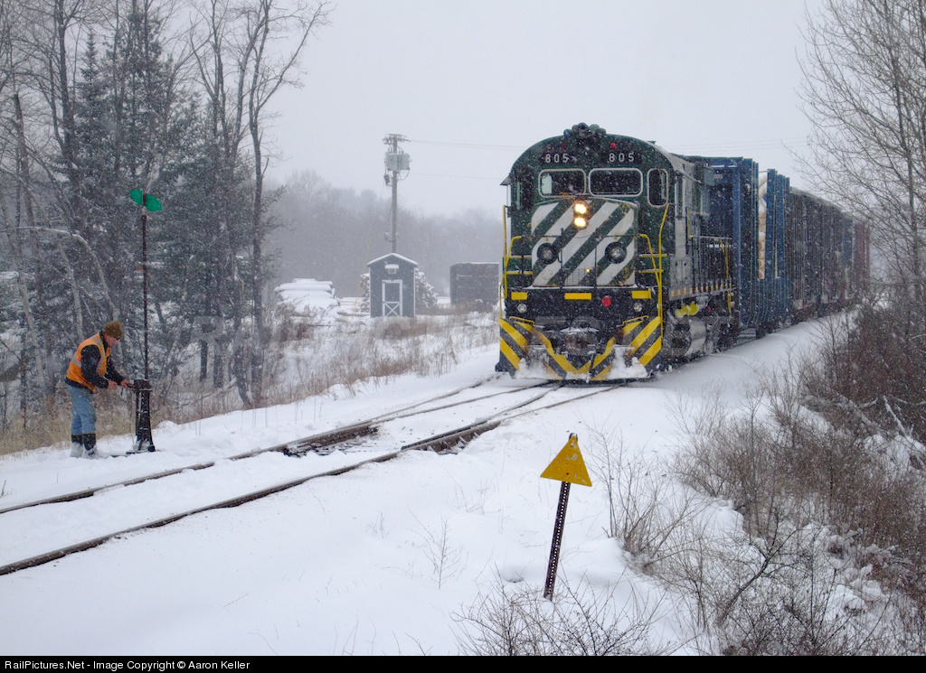 Battling a typical Upstate New York snowstorm, an MA&N crewmember locks the switch on a siding leading into a telephone pole loading yard in Boonville before heading south to Utica. Today's train — outbound telephone poles and boxcars that were consigned to Burrows Paper — is indicative of the forest products region this railroad serves. (Note also the piles of logs off in the distance.) Today's train went as far north as Lyons Falls, the northern end of the MA&N's southern division. Service to Lyons Falls is sporadic these days because the chief industry there, Lyons Falls Pulp & Paper, shut down a decade ago. Thankfully, business on the southern end of the line remains brisk, keeping veterans Alcos such as this one carrying on the long and storied tradition of mountain railroading close to the Adirondack park. The high switch stand and the triangular yellow flanger board are indicators of the amount of snow this part of Upstate New York can receive! Digital Photo.