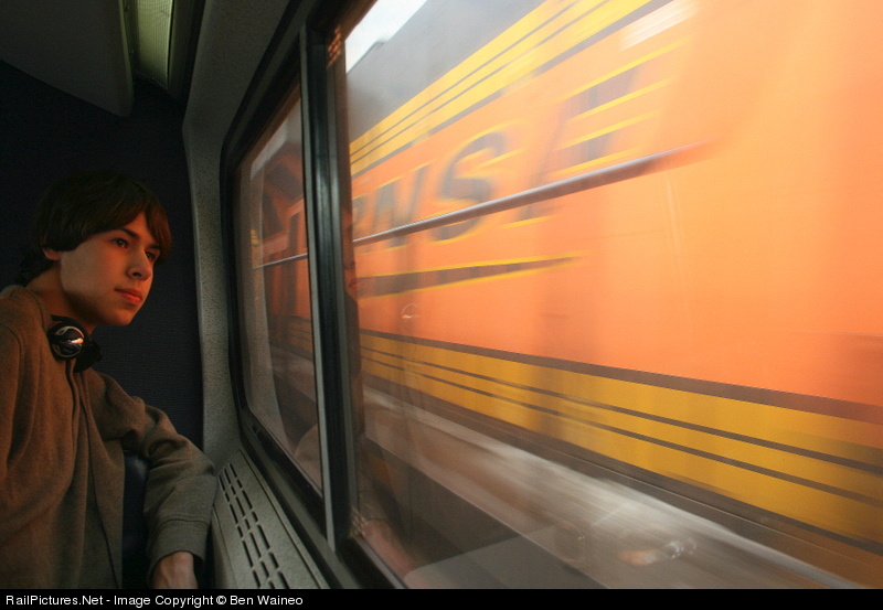 A happy railfan watches as this BNSF train goes by. The "swoosh" logo really comes into effect here. The shot is taken looking out of the window of Amtrak train #351 from Birmingham Michigan to Chicago Illinois