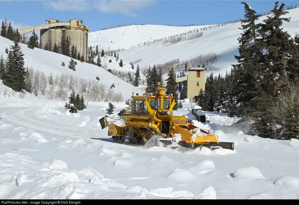 | The Skyline loadout at the end of the Union Pacific’s Pleasant Valley Subdivision in Utah is right at 8000’ elevation. It has a pretty stout winter and lot of snow. Normally the near daily coal trains keep the snow plowed off the tracks pretty well. However today, a UP track inspector told me that they were going to run a snowplow on the branch. I hustled down to the highway crossing just north of the town of Scofield to wait for said plow. Well, it was no rotary plow; not even a wedge plow or a spreader. The “snowplow” was this ballast regulator. The picture of it in action is on the tail track of the Skyline loadout. |