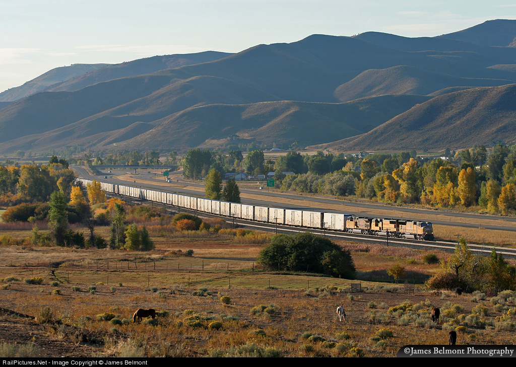 A UP train of empty refrigerator cars rolls downgrade along the Weber River at Henefer, Utah. This train originated at CSX's yard at Selkirk, New York and will terminate at Delfar (Delano-McFarland), California.