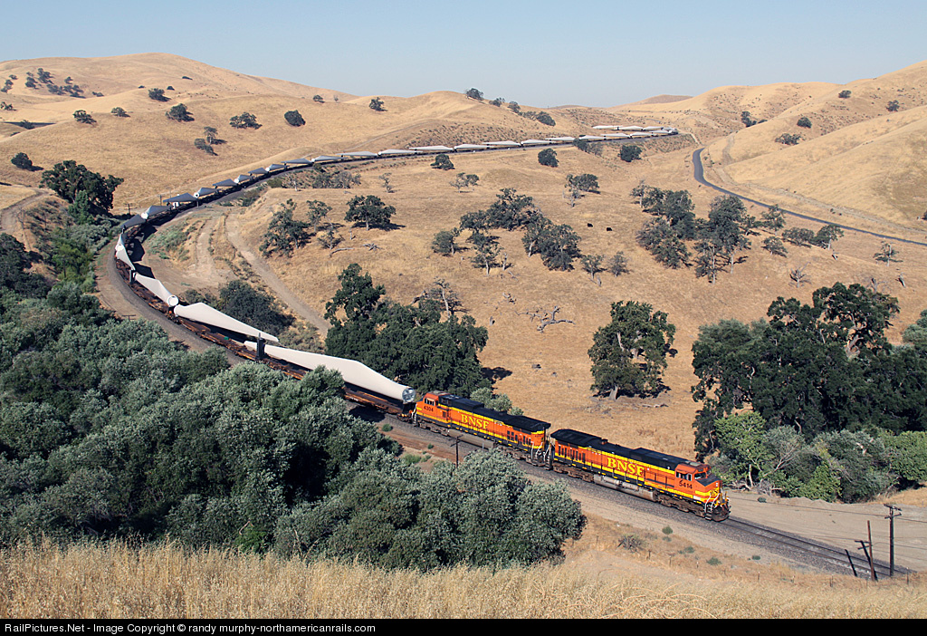 | Here is a unit train of wind mill blades for more of the wind farms that line the mountainsides near Tehachapi, CA. Each pair of blades is loaded on a 5-unit spine car with a special mounting on the center car so the blade tips will pivot as the car moves through a curve. |