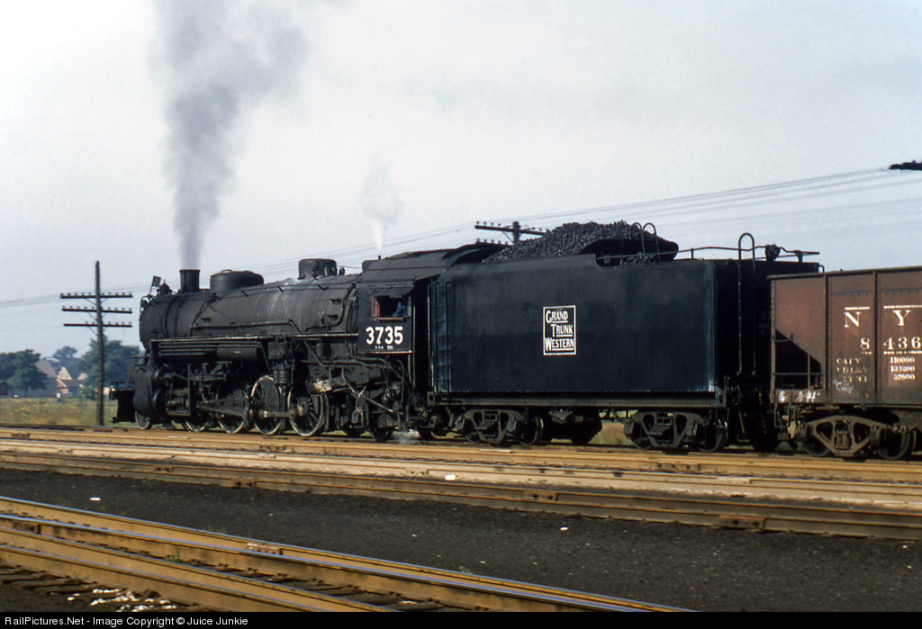Elsdon Yard, on Chicago's southwest side, had a roundhouse and service facilities for Grand Trunk Western steam power until the end of the steam era. We visited the yard and found a good number of live locomotives at the roundhouse and working the yard. GTW 3735, a good looking Class S-3-a Mikado, leaves Elsdon Yard with a freight headed south.
