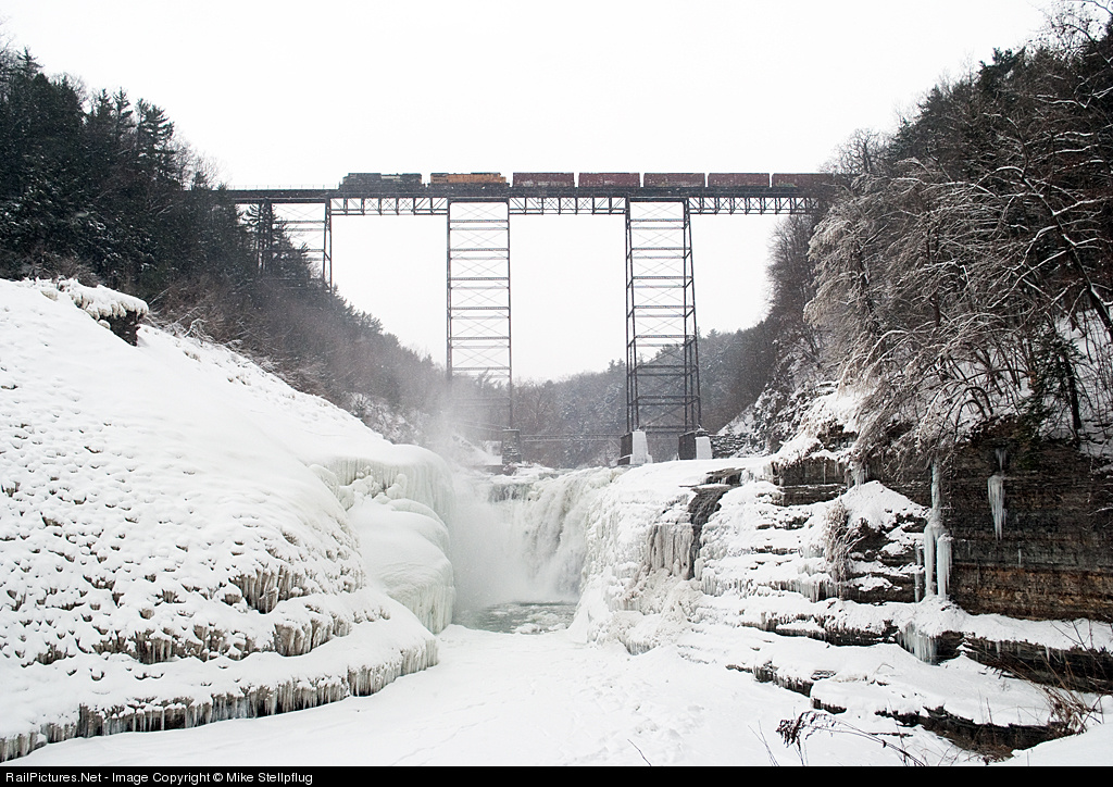 NS train 310 crosses the Portage Bridge on a very Wintery afternoon as viewed from the Upper Falls side of the trestle. The 2nd unit is an ex UP leaser.
