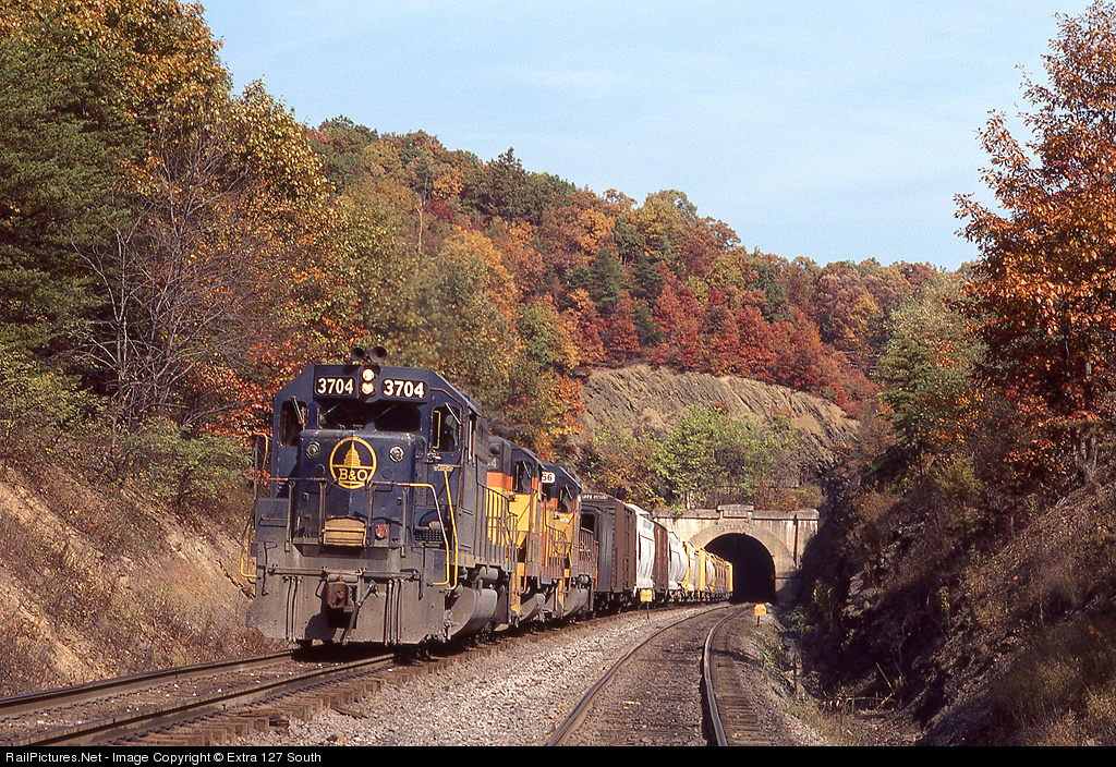 A westbound B&O manifest exits Stuart Tunnel at Magnolia, WV on October 21, 1979. At over 3,000 feet, Stuart is the longest of the four tunnels on the Magnolia Cut Off. It was also the most problematic to construct, suffering several cave ins because of the type of rock. Notice the slow order boards on the eastbound track. It has always been extremely wet and slow orders in the tunnel were not uncommon.