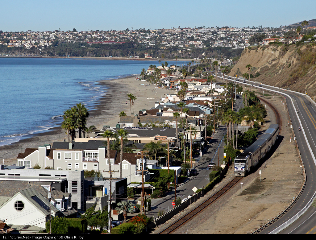 A southbound Pacific Surfliner heads along the Pacific Coast Highway, bypassing multi-million dollar beachfront homes and the picturesque Left Coast along the way.