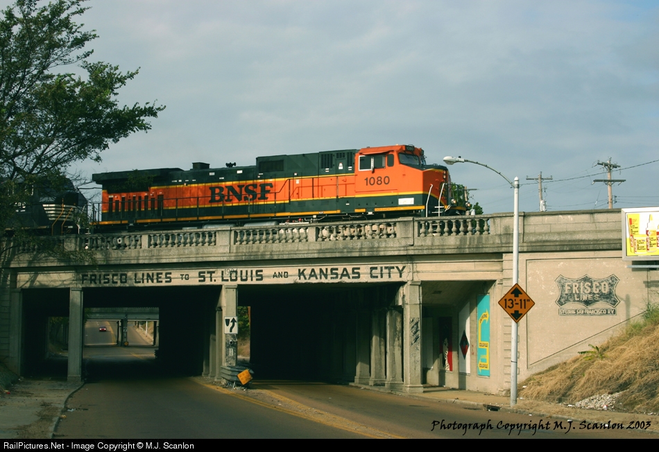 BNSF 1080 crosses over Bellevue Blvd. on the old Frisco overpass built in 1924.