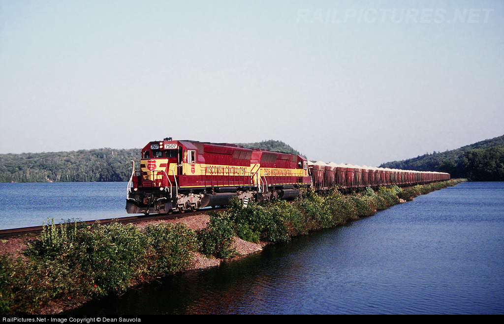 SORE2 brings a trainload of limestone across Goose Lake on the way to the Empire Mine. A beautiful September day is in evidence as the broom is used to prop open the cab door and let the air in. The silver paint on the 7507's trucks show their Santa Fe heritage. The cars still bear their C&NW paint and markings. Within a year or so the ore cars would recieve WC maroon paint and SSAM reporting marks. Once CN took over, the SD45s were eliminated and now the ex-C&NW cars are gone too.
