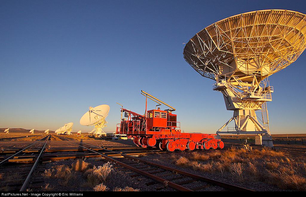 In a remote part of the New Mexico desert is a double track railroad that radiates in three directions to no-where. This railroad carries the dishes of the Very Large Array radio telescope network into the various configurations needed to probe deep space. The dishes are moved by a lifting locomotive that has four trucks in a side-by-side arrangement and transports the dishes to the various pre-set footings along the 13 mile mainline. There are 9 of the 80” diameter dishes per line and they move in and out much like a lens. When in the close configuration, they act in unison like a wide-angle lens, when in the furthest spread configuration, like a telephoto lens. As well as another lifting locomotive, the line also has a track-mobile and several hoppers to spread ballast along with a ballast tamper.