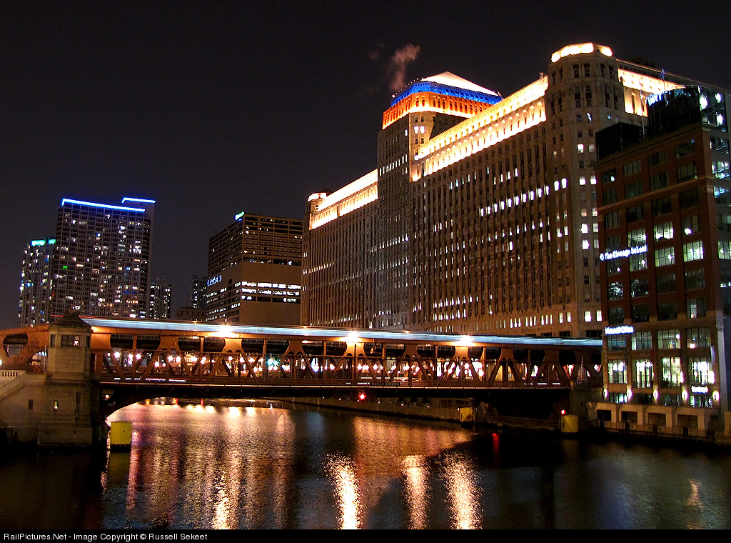 | A Brown Line train crosses the Chicago River on it's trip into the Loop. The Merchandise Mart is lit up in Bears blue and orange in preparation for the game against Green Bay. The Bears lost 21-14 and angered many Chicago sports fans. |