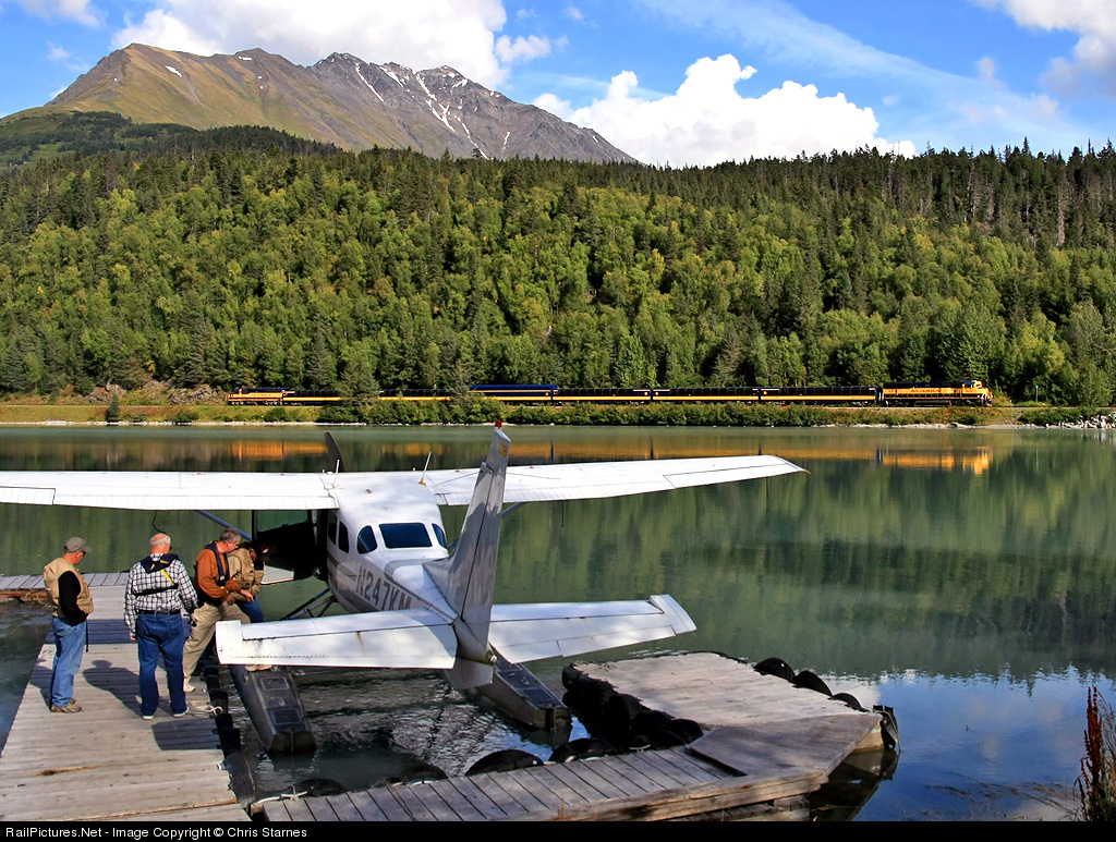 | A Seward-bound ARR Cruise Train skirts the Upper Trail Lake at Moose Pass, Alaska on a beautiful late summer day as a few flyers are about to take a Cessna float plane up for a flight in the foreground. This train originated earlier this day in Seward and ran north to the airport in Anchorage and is now southbound back toward Seward with a fresh load of tourists. |