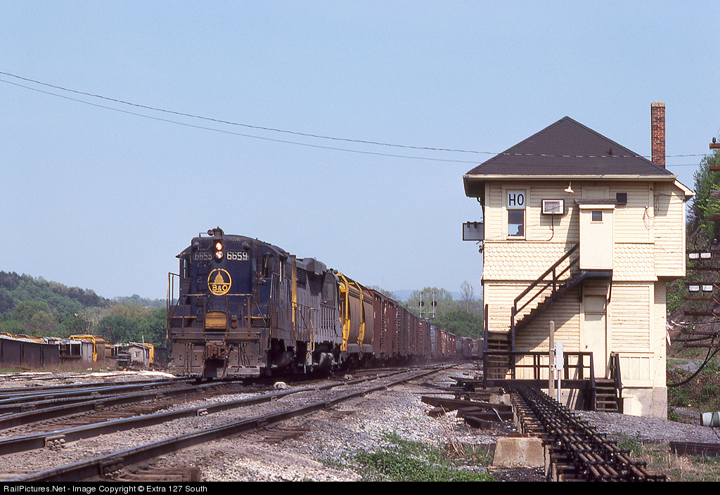 | A westbound B&O manifest passes HO Tower at Hancock, WV on May 1, 1977 with B&O GP7 No. 6659 and a C&O GP30. |