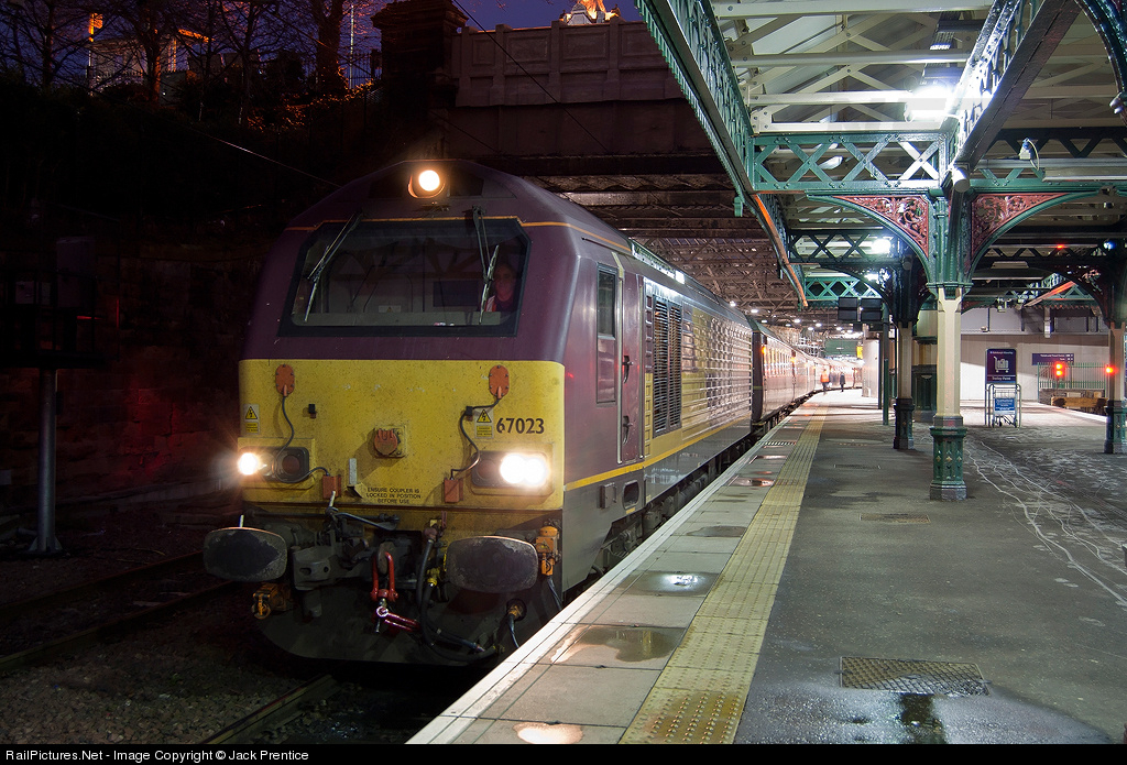 | DB Schenker 67023 stands in Edinburgh Waverley awaiting to work 2L69 Edinburgh Waverley - Cardenden (Fife) Scotrail loco hauled train which runs in place of a scotrail unit |